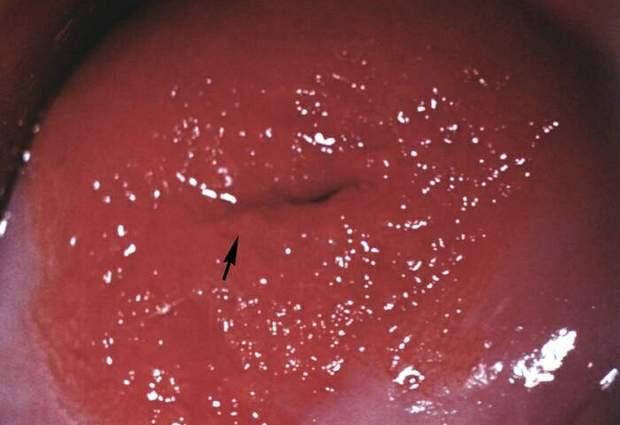 Истинная эрозия шейки матки . Диагноз ставится при наличии на мягких тканях шейки матки видимых глазу изменений. Гинеколог во время осмотра при помощи зеркал может увидеть пятно ярко красного цвета с четко очерченными границами. Располагается дефект вокруг внешнего зева матки. Диаметр измененной ткани может достигать 1 см. Заболевание находится в такой стадии до 2 недель, после чего происходит переход на стадию эктопии.