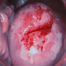 Лейкоплакия – ороговевшая бляшка на поверхности шейки матки. Нередко возникает после перенесенного воспалительного процесса и требует проведения биопсии, кольпоскопии и гистологии, для подтверждения диагноза, и обязательного лечения.